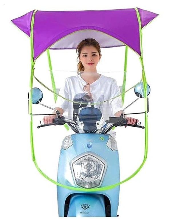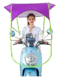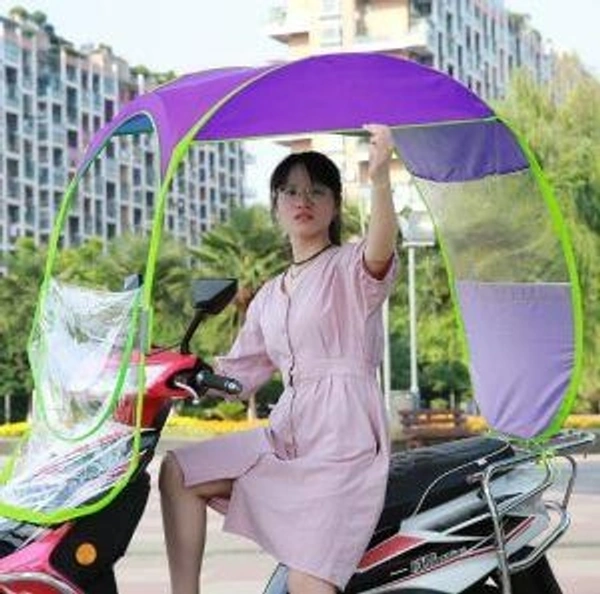 Much better than those open bike umbrellas which can still get you wet and dusty. Road runner Canopy equipped biker does not need a raincoat nor a sun umbrella. Protects Motorcycle / Bicycle riders from the Sun or Rain and Dust High-tech Anti-UV Coated fabric for coolness. Steel Frame bolts onto side mirror brackets and ties onto back carrier Zippered front windshield side that can be opened when biker feels hot or unclear and closed in strong rain or dusty environment. Well designed wind resistant steel frame neon green trim and high visibility reflector at rear for extra safety