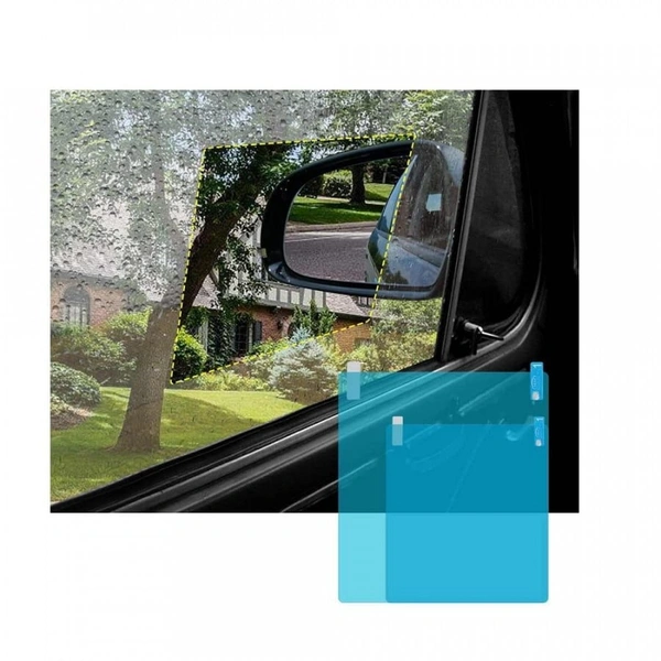 HIGH TECHNOLOGY MATERIAL : PET+Nano coating waterproof film with 99% high transmittance, Anti-fog, anti- glare, anti-mist, rainproof, which can prevent strong light reflection, reduce dazzle light, relax visual fatigue, effectively protect your driving safety in a rainy or foggy days and keep your rearview mirror clear all the time.; Rear View Mirror For Car -Car Side Mirror Rain Guard and can also be used as anti fog stickers.